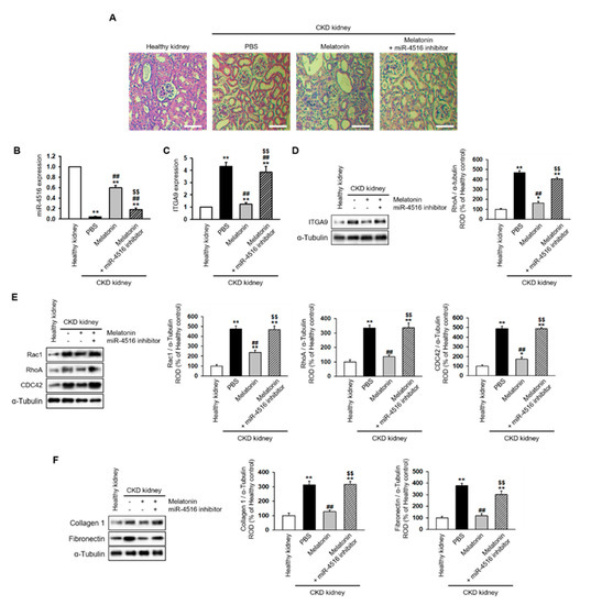 Herein, we present in vivo data showing that intraperitoneal injection of melatonin directly decreased CKD fibrosis and glomerulus swelling, leading to restored kidney function in a mouse model of CKD. Melatonin injections also resulted in increased miR-4516 expression in the kidney cortex. Thus, the melatonin-induced effect on miR-4516 expression reduced renal cortical fibrosis by suppressing cytoskeleton reorganization signaling, and attenuated ITGA9-Rho GTPase signaling activation.
