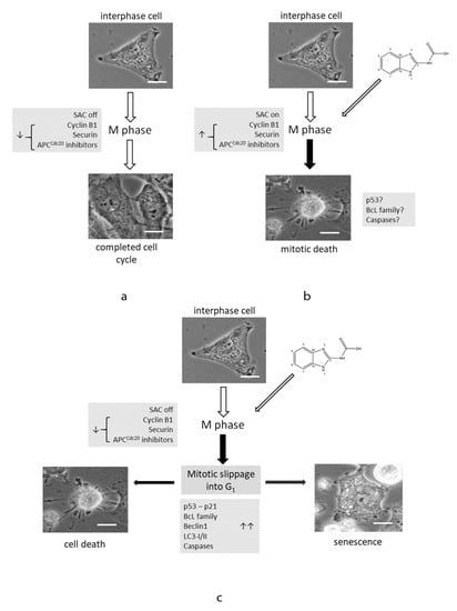 In the past decades, the term mitotic catastrophe (MC) has been used to describe a mode of cell death resulting from abnormal mitosis caused by diverse stressors. Our current understanding of this process embraces its more functional definition as it is postulated that MC represents a sequence of events which acts to prevent genomic instability of cells via inducing mitosis-linked delayed cell death or permanent cell cycle arrest with subsequent senescence. As such, under physiological circumstances, MC functions as one of the oncosuppressive mechanisms which has recently gained considerable interest among biomedical scientists due to its potential to eliminate potential or nascent tumor cells. Cells where MC is stimulated often increase their volume, show the gross nuclear alterations such as micro- and macronucleation and may accumulate in the particular phase of the cell cycle. Still, since the process of MC and the type of (malignant) cell, as well as the nature of triggering stimulus, are not homogeneous, the activated signaling and the final cell phenotype are more than likely to differ. Accordingly, at least three scenarios of MC have been described [69,75] in which (1) the cell might activate cell death machinery in the presence of elevated cyclin B1 levels, i.e., while it is still in mitosis, or (2) the cell is firstly allowed to complete mitosis and in the subsequent interphase may undergo cell death, in a delayed manner. This particular instance is referred to as mitotic slippage or mitotic checkpoint adaptation. Finally, (3) the cell is firstly allowed to complete mitosis and in the subsequent interphase develops the senescent phenotype [76]. Accordingly, tumor cell populations exposed to MC-inducing agents are likely to respond with a significant degree of heterogeneity including the appearance of several cell phenotypes whose relative proportions and fates may ultimately reflect the evolutionary status and the nature of the particular tumor [77,78,79]. Thus several research groups have reported that tumor cells exposed to benzimidazoles in vitro become polyploid, aneuploid or senescent, upregulate autophagy and die via apoptosis or necrosis [80,81,82]. In Figure 1, two possible scenarios of benzimidazole-exposed GBM cells responses are shown including cell morphologies as well as select molecular players. Morphological appearance of cells exposed to MC-inducing agents provides basic clues about the spectrum and rates of individual cell phenotypes (i.e.,); however, as such, is considered inadequate without the molecular nature of the underlying processes [83]. Accordingly, additional or alternative verification of cell status is necessary due to at least two reasons. Firstly, diagnostic procedures in clinical practice rely mostly on histopathological examination of the preserved tissue/tumor section where an overall architecture is graded, while nowadays the emphasis on the expression of a given molecular marker too. The direct evaluation of cell phenotypes is thus limited to in vitro or ex vivo studies.
