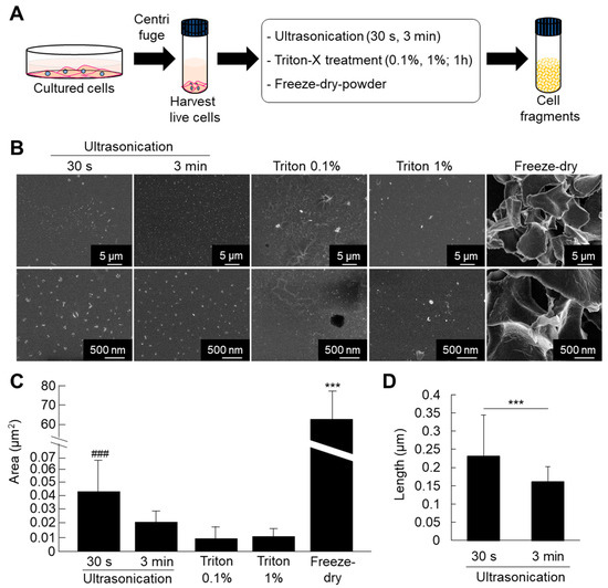 (A) Protocol for fabrication of cell fragments by mechanical and chemical methods. (B) Ultrastructural analysis of the cell nanofragments obtained by mechanical and chemical disruption of ATDC5 cells, observed by SEM. Note that the cell nanofragments obtained by ultrasonication for 3 min were smaller and more homogenous compared to those obtained by ultrasonication 30 s. Triton-treated (0.1% and 1%) samples showed a thin film-like structure. Freeze-dried powder fragments were large, at the micrometer level. (C) Graph shows the quantitative analysis of the average area (µm2) of the fragments. Note the high standard deviation in the cell nanofragments obtained by ultrasonication 30 s and freeze-dried powder, representing the heterogeneity of the cell fragment size. *** p ≤ 0.001, ANOVA, Bonferroni post-hoc test. Freeze-dried powder samples were significantly larger than all other samples. The size of the cell nanofragments obtained by ultrasonication 30 s was significantly larger compared to ultrasonication 3 min or triton treatments. ### p ≤ 0.001, ANOVA, Bonferroni post-hoc test, excluding the freeze-dried powder group in the analysis. (D) Graph shows the quantitative analysis of the length (nm) of the cell nanofragments obtained by ultrasonication 30 s or 3 min. The cell nanofragments obtained by ultrasonication 3 min were significantly smaller than those obtained by ultrasonication 30 s. The high standard deviation of the nanofragments obtained by ultrasonication 30 s demonstrates the heterogeneity of the sample.