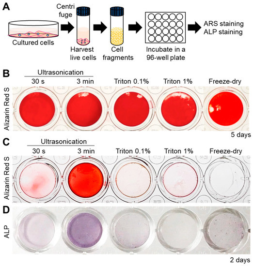 Next, the mineralization ability of all the cell fragments was assessed by incubating them in normal culture medium (α-MEM) supplemented with 10 mM β-Glycerophosphate (β-GP, Figure 2A). Alizarin Red S (ARS) staining for detection of calcium revealed that all cell fragments were able to promote mineral formation within 5 days (Figure 2B). Interestingly, however, mineralization was faster in the case of 3 min-ultrasonicated nanofragments compared to those obtained by all other methods, after 2 days of culture (Figure 2C). The faster mineralization of 3 min-ultrasonicated nanofragments corresponded with a high activity of alkaline phosphatases (ALPs) in the samples (Figure 2D), suggesting that ALPs are crucial enzymes determining the mineralization of the cell nanofragments by cleaving phosphate-containing molecules (e.g., pyrophosphate, phosphoproteins, β-GP) and releasing free phosphate ions that subsequently react with calcium.