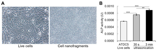 (A) Bright-field images of live cells (ATDC5 cells) on the left, and the cell nanofragments on the right side. (B) Graph shows the alkaline phosphatase enzymatic activity in live cells, as well as in the cell nanofragments immediately after cell disruption by ultrasonication for 30 s or 3 min. Note that cell disruption by ultrasonication increases the activity of alkaline phosphatases, and is significantly higher in the cell nanofragments obtained from ultrasonication 3 min. ** p ≤ 0.01 and *** p ≤ 0.001, ANOVA, Bonferroni post-hoc test.