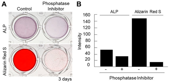 For the inhibition assay, ATDC5 cell nanofragments (300 µg/mL) were incubated with 1 μL of phosphatase inhibitor cocktail-2 (Sigma-Aldrich) within 100 μL of α-MEM supplemented with 10 mM β-GP into a 96-well tissue culture plate for 3 days. The phosphatase inhibitor cocktail-2 contains sodium orthovanadate, which inhibits a number of ATPases, protein tyrosine phosphatases, and other phosphate-transferring enzymes; sodium molybdate, which inhibits acid and phosphoprotein phosphatases; sodium tartrate, which inhibits acid phosphatases; and imidazole, which inhibits alkaline phosphatases. After incubation, the samples were fixed with 4% PFA overnight, gently washed with DW, and stained with ARS and ALP staining solutions.