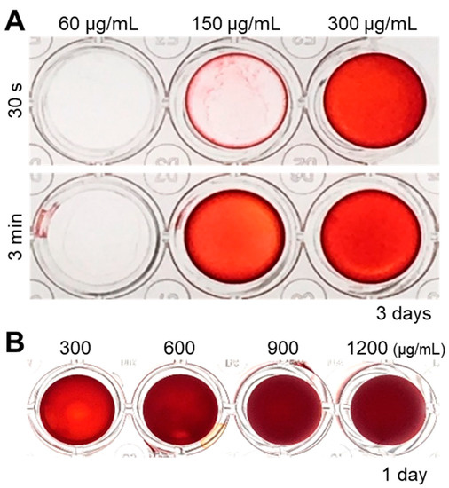 (A) Analysis of the optimal concentration of cell nanofragments obtained from ATDC5 cells. Cell nanofragments at different concentrations (60 μg/mL, 150 μg/mL, and 300 μg/mL) were incubated in α-MEM supplemented with 10 mM β-glycerophosphate (β-GP) for 3 days. ARS staining demonstrates the rapid mineralization of the cell nanofragments obtained by 3 min ultrasonication, compared to those obtained by ultrasonication 30 s. After 3 days of incubation, the concentration of 150 μg/mL (ultrasonication 3 min) was the minimum amount of nanofragments necessary to obtain a thin and homogeneous mineralized layer. (B) ARS staining of cell nanofragments incubated for 1 day at concentrations above 300 μg/mL. The concentration of 300 μg/mL was the minimum amount of nanofragments required to obtain a thin and homogeneous mineralized layer after 1 day of incubation. Concentrations above 300 μg/mL showed a thick layer, which could be retaining small amounts of the ARS compound inside.