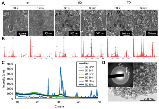 On the other hand, the results of X-ray diffraction (XRD) analysis identified the initial minerals to be amorphous calcium phosphate (3 and 5 days), which then crystallized into hydroxyapatite (HAp) after 7 days of incubation (Figure 6C). Note the broad peak in the 31–33° 2θ region characteristic of the 211, 112, and 300 planes of HAp, suggesting the low crystallinity of the HAp product formed from the cell nanofragments incubated for 7 days. The same pattern of crystalline phase change was observed in the cell nanofragments obtained by ultrasonication 30 s and 3 min (Figure 6C). Further qualitative analysis of the minerals by transmission electron microscopy (TEM)/electron diffraction confirmed that they were HAp (Figure 6D, insert).