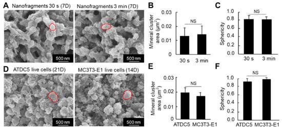 (A) SEM images of the mineral structures formed from cell nanofragment mineralization after treatment with NaClO to remove all organic material. (B,C) Graphs show the mineral cluster area (B) and the sphericity (C) of the minerals formed by the mineralization of cell nanofragments obtained by either 30 s or 3 min of ultrasonication. (D) SEM images of the mineral structures formed from ATDC5 and MC3T3-E1 live cells cultured for 21 and 14 days, respectively, in mineralization-inducing conditions. The minerals were treated with NaClO to remove all organic material. (E,F) Graphs show the mineral cluster area (E) and the sphericity (F) of the minerals formed by the mineralization of ATDC5 and MC3T3-E1 live cells. Note that the size and quasi-spherical shape of the minerals formed from the cell nanofragments were comparable to those formed by ATDC5 and MC3T3-E1 live cells. NS = non-significant, Student’s t-test.