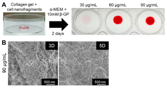 Finally, we tested whether the cell nanofragments could be used as a biomaterial for 3D bone-like tissue synthesis. As shown in Figure 10A, ATDC5-derived cell nanofragments were mixed with collagen gel for the fabrication of a 3D collagen-cell nanofragment-mineral complex structure, which was achieved in just 2 days with cell nanofragment concentrations of 60 µg/mL and 90 µg/mL, but not at a concentration of 30 µg/mL. Further analysis of the collagen-cell nanofragment-mineral complex microstructure by SEM showed in detail the mineral deposition onto the collagen fibers after 3 days, and a high mineralized structure after 5 days of incubation (Figure 10B). These results indicate that the cell nanofragments can be novel tools for fabrication of 3D structures of diverse shapes which can mimic a bone-like structure.