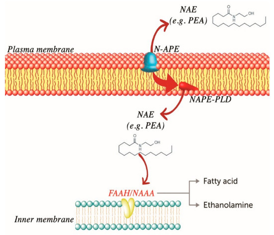 The biosynthesis of PEA occurs through a common enzyme for the other NAEs, the selective phospholipase N-acyl-phosphatidyl-ethanolamine D (NAPE-PLD), starting from the hydrolysis of the precursor N-palmitoyl-phosphatidyl-ethanolamine (NAPE) [119]. PEA degradation occurs through the action of two separate enzymes: the first specific for PEA, the amidase of N-acylethanolamine-hydrolysing acid (NAAA), while the second, the FAAH enzyme, deputy to the hydrolysis of PEA and the other NAEs [111,116,117,120]. See Figure 1.