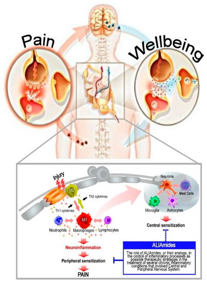 Peripheral neuropathic pain is a very common condition and it remains one of the most difficult diseases to treat. This is probably due to the multiple signalling mechanisms underlying pain transmission (Figure 2). As mentioned previously, a greater knowledge of the role of neuroinflammation in neuropathic pain could open new perspectives for therapies aimed at modulating the activation of neuronal and non-neuronal cells that normally control neuronal sensitization. Currently, drug therapies in treating neuropathic pain involve the use of opioids, tricyclic antidepressants, and anti-convulsants, which exhibit a wide spectrum of adverse side effects. Hence, research is focused on identifying alternative therapies with less side effects. The present review sheds light on the effects of ALIAmides in attenuating pain, in particular peripheral neuropathic pain. The capacity of ALIAmides to exert antiallodynic and anti-hyperalgesic effects by down-modulation both microglial and mast cell activity has led to the hypothesis that these compounds could represent an innovative therapeutic strategy for the treatment of all conditions that are characterized by the presence of neuroinflammatory processes and chronic painful states.