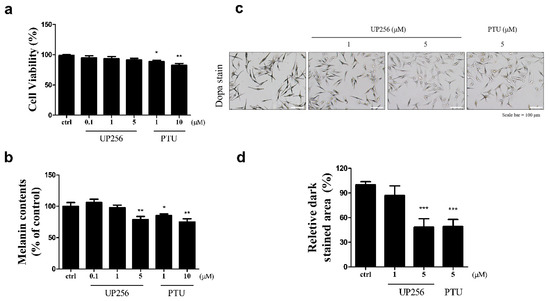 Effects of UP256 on melanogenesis in NHEM. Cell viability (a) and melanin content were measured (b) after treatment with UP256 (0.1, 1, and 5 µM) for 72 h. PTU was used as a positive control. In situ tyrosinase activity in NHEMs was observed via L-DOPA staining (c). Scale bar = 100 µm. Relative amounts of stained area were measured with the ImageJ program. The results are calculated as a percentage of the vehicle-treated control (d) and expressed as mean ± SD of three independent experiments (* p < 0.05 ** p < 0.01, and *** p < 0.001, compared with the vehicle-treated control).