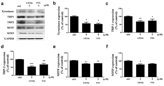 Tyrosinase, TRP-1, TRP-2, and SOX9 are simultaneously regulated by each other during melanogenesis. We observed the effect of UP256 on the expression of these melanogenic enzymes via western blot analysis (Figure 2a). UP256 significantly inhibited the expression of tyrosinase (approximately −43%), TRP-1 (−32%), TRP-2 (−47%), MITF (−19%), and SOX9 (−23%) at 5 µM, compared to the vehicle-treated cells after 72 h of treatment. UP256 reduced the expression of tyrosinase and MITF similarly, but it reduced TRP-1, 2, and SOX9 more effectively, compared to PTU (Figure 2b–e).