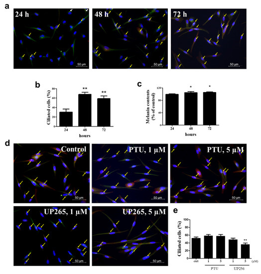 To investigate the relationship with melanogenesis and cilia formation, we measured the cilia formation and melanin contents of melanocytes were increased over time (24, 48, and 72 h) (Figure 4a). As shown in Figure 4b,c, we observed that the melanin slightly increased as time passed, and the formation of cilia also increased at 48 and 72 h. We also measured cilia formation in the sample treatment group (Figure 4d). UP256 treatment decreased approximately 20% of cilia formation in melanocytes compared to the control group, but PTU treatment did not change the cilia (Figure 4e).
