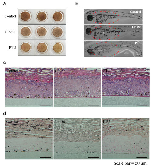 Depigmentation effects of UP256 in reconstructed skin and zebrafish. A total of 0.05% UP256 (w/v) and 0.1% PTU (w/v) were applied, respectively, to the reconstructed skin tissue for 14 days. Following the incubation period, the tissue was photographed using a digital camera (a). Synchronized zebrafish embryos were treated with 30 μM UP256 and PTU and observed under a stereomicroscope after 72 h (b). Reconstructed tissues were fixed and stained with H&E (c) and Fontana-Masson silver stains (d). Scale bar = 50 µm.