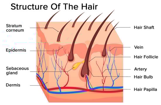 - Brown, T.M.; Krishnamurthy, K. Histology, Hair and Follicle. In StatPearls; StatPearls Publishing LLC.: Treasure Island, FL, USA, 2020. [Google Scholar]