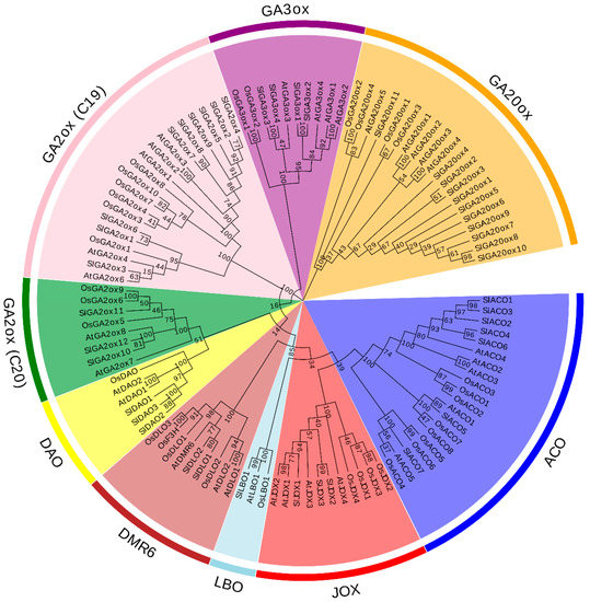 Supplementary materials can be found at https://www.mdpi.com/1422-0067/21/15/5344/s1, Figure S1: Phylogenetic tree of DOXC family proteins identified in Arabidopsis, rice, and tomato, Figure S2: Chromosomal location and duplication analysis of hormone biosynthetic and metabolism genes in tomato, Figure S3: Sequence alignment of GA20ox group proteins, Figure S4: Sequence alignment of GA3ox group proteins, Figure S5: Sequence alignment of GA2ox (C19) group proteins, Figure S6: Sequence alignment of GA2ox (C20) group proteins, Figure S7: Sequence alignment of ACO group proteins, Figure S8: Sequence alignment of DAO group proteins, Figure S9: Sequence alignment of Jox group proteins, Figure S10: Sequence alignment of DMR6 group proteins, Figure S11: Sequence alignment of LBO group proteins, Figure S12: The concentrations of GA1, GA4, and IAA decrease from the mature-green (Mg) to the breaker (Br) stage, Table S1: Identification and characterization of hormone biosynthetic and metabolism proteins in Arabidopsis, rice, and tomato, Table S2: Microsynteny relationships of hormone biosynthetic and metabolism genes in Arabidopsis, rice, and tomato, Table S3: Duplication modes of hormone biosynthetic and metabolism genes in tomato, Table S4: Motif composition in DOXC class of 2OGD family in Arabidopsis, rice, and tomato, Table S5: Motif sequence identified by MEME tools in Arabidopsis, rice, and tomato DOXC class of 2OGDs, Table S6: Primers used in this study.