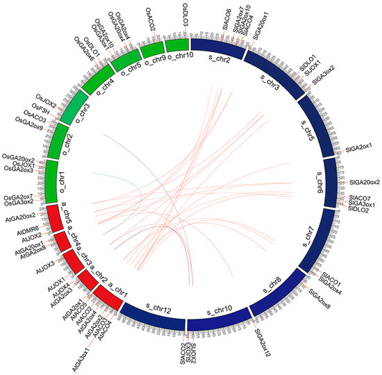 Synteny analysis of hormone biosynthetic and metabolism 2-oxoglutarate-dependent dioxygenase (2OGD) genes among Arabidopsis, rice, and tomato. Chromosome numbers of Arabidopsis (At), rice (Os), and tomato (Sl) are indicated on the inner side. Red, green, and blue colors represent Arabidopsis, rice, and tomato chromosomes. Gene pairs with a collinear relationship are joined by lines. Red lines represent collinear pairs between Arabidopsis and tomato, blue lines represent collinear pairs between Arabidopsis and rice, green lines represent collinear pairs between rice and tomato.