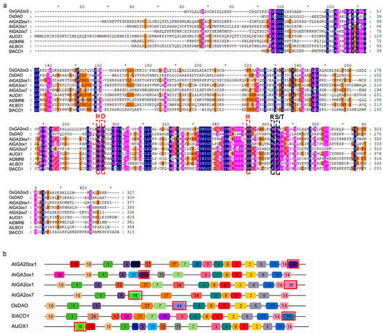 To determine the functional similarity of hormone biosynthetic and metabolism 2OGD proteins of tomato with those of Arabidopsis and rice, we performed multiple sequence alignments and motif composition analysis. Two 2OGD-family proteins of known three-dimensional structure—OsGA2ox3 and OsDAO [17], and seven hormone biosynthetic and metabolism 2OGD-family proteins—AtGA20ox1, AtGA3ox1, AtGA2ox7, SlACO1, AtJOX1, AtDMR6, and AtLBO1—which have been functionally characterized were aligned to identify conserved domains or motifs in 2OGD family. The result showed that the above 2OGD proteins had the HxD…H and RxS/T conserved motifs in OsGA2ox3 and OsDAO (Figure 3a), which recruit Fe(II) as a cofactor and co-substrate. Further, among the hormone biosynthetic and metabolism 2OGD proteins in Arabidopsis, rice, and tomato, SlGA20ox8, SlGA20ox9, SlGA20ox10, SlGA2ox12, and OsACO6 did not have an HxD…H motif, while SlGA20ox7, SlGA20ox10, OsGA2ox10, SlGA2ox12, and OsACO6 lacked an RxS/T motif (Figures S3–S11), suggesting that these proteins do not have 2OGD biological activity.