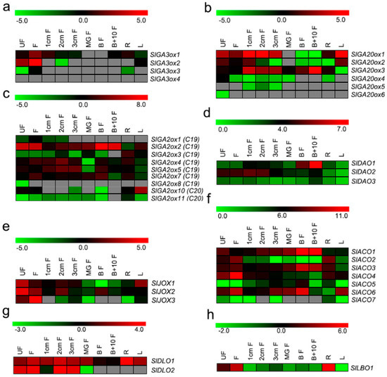 To assess the function of identified hormone biosynthetic and metabolism 2OGD genes in tomato, we analyzed online transcriptome data of tomato roots, leaves, flowers, and developing fruits. Most genes exhibited distinct spatial and temporal expression patterns (Figure 4). Three GA3ox genes exhibited the highest expression in flowers, SlGA3ox1 had moderate expression in roots and early developing fruits, and SlGA3ox2 had moderate expression in leaves. No GA3ox gene was expressed during fruit ripening (Figure 4a). Regarding the GA20ox family, SlGA20ox1, SlGA20ox2, and SlGA20ox3 were highly expressed in flowers and early developing fruits; SlGA20ox1 and SlGA20ox3 were also expressed in roots, and SlGA20ox1 and SlGA20ox2 were expressed in leaves. SlGA20ox4 was specifically expressed in unopened flowers. Only SlGA20ox3 was expressed during fruit ripening, during which its expression increased continuously (Figure 4b). Five GA2ox-family genes (SlGA2ox3, 4, 5, 7, and 10) showed high expression in roots, three (SlGA2ox2, 3, and 10) in leaves, and six (SlGA2ox1, 2, 4, 5, 7, and 10) in flowers. In addition, four genes (SlGA2ox2, 4, 5, and 7) had high expression in early developing fruits, which increased during fruit ripening (from the mature-green stage to the breaker stage) (Figure 4c). Among the DAO family, the expression of SlDAO1 was high in ripening fruits, moderate in early fruits, and low in roots, leaves, and flowers. SlDAO2 was expressed mainly in flowers and early fruits, while the expression of SlDAO3 was negligible in all organs. Notably, SlDAO1 expression increased significantly from the mature-green to the breaker stage, suggesting a role in fruit ripening (Figure 4d). The expression of the three JOX-family genes was highest in flowers, while that of SlJOX1 and SlJOX2 was moderate in roots, leaves, and early developing fruits, and SlJOX2 was expressed in breaker fruits (Figure 4e). Regarding the ACO family, three genes (SlACO2, 3, and 4) were expressed in roots, two (SlACO4 and 5) in leaves, and five (SlACO1, 2, 3, 4, and 6) in flowers. Further, four genes (SlACO1, 3, 4, and 6) had high expression in early developing fruits, and the expression of four other genes (SlACO1, 3, 5, and 6) increased from mature-green to breaker fruit (Figure 4f). The DLO-family gene SlDLO1 showed high expression in roots, leaves, flowers, and early fruits, and decreased expression in ripening fruits, while SlDLO2 was expressed only in flowers and early fruits (Figure 4g). The only LBO gene in tomato, SlLBO1, was expressed mainly in roots and flowers, suggesting roles in root and flower development (Figure 4h). In conclusion, a variety of 2OGD hormone biosynthetic and metabolism genes play roles in organ development and fruit ripening in tomato.