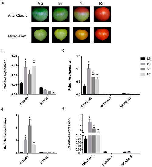 Expression analysis of SlDAOs and SlGA2oxs genes during tomato fruit ripening in the pericarp. (a) Different ripening stages of Ai Ji Qiao Li and Micro-Tom. (b) Expression levels of SlDAOs in Ai Ji Qiao Li. (c) Expression levels of SlGA2ox genes in Ai Ji Qi Li. (d) Expression levels of SlDAOs in Micro-Tom. (e) Expression levels of SlGA2ox genes in Micro-Tom. Mg: mature-green; Br: breaker; Yr: yellow-ripening; Rr: red-ripening. * The asterisk at the top of each column indicates a significant difference compared to Mg fruits at p < 0.05 (n = 3) by students t-test.