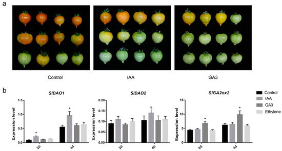 Expression analysis of SlDAO1, SlDAO2, and SlGA2ox2 after auxin, GA3, and ethylene treatments. (a) Photos of mature-green fruits after indole-3-acetic acid (IAA) and gibberellin 3 (GA3) treatment, respectively. (b) Expression analysis of SlDAO1, SlDAO2, and SlGA2ox2 after auxin, GA3, and ethylene treatments. * The asterisk at the top of each column indicates a significant difference at p < 0.05 (n = 3) by students t-test.