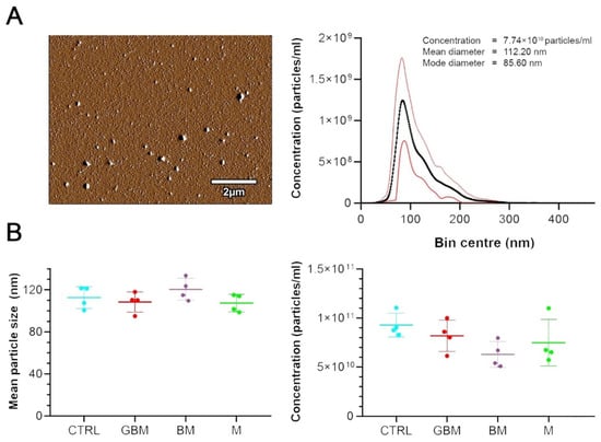 To verify the value of circulating extracellular vesicles as potential biomarkers for CNS tumors, EVs were isolated from the serum of patients with glioblastoma multiforme (GBM), single brain metastasis originating from non-small-cell lung cancer (BM) and meningioma (M), as well as from control patients with lumbar disc herniation (CTRL). Each group included 24 individuals of both genders with various ages. Extracellular vesicles were isolated from the sera by differential centrifugation and were characterized by atomic force microscopy (AFM) and nanoparticle tracking analysis (NTA). Pools of 6 samples were formed in all groups, allowing four parallel samples to be tested per group (see in Section 4.1). Western blot analyses were also performed to demonstrate the EV nature (Figure S1).