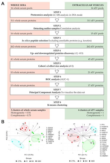 Following protein selection, PCA (Step 7) was performed to visualize the dataset, where several potentially correlated proteins were projected into a smaller number of variables. K-means clustering (Step 8) on the whole serum PCA biplot resulted in 3 inhomogeneous or incomplete clusters. Calculated cluster homogeneity and completeness scores are 0.56 and 0.73, respectively. In contrast to whole serum samples, the clustering of sEV samples formed homogeneous and complete clusters, with homogeneity and completeness scores of 1. The results of the PCA analyses and k-means clustering indicate considerable differences between the whole serum and sEV samples (Figure 2B). We found that the accuracy of distinguishing between various CNS tumors can be increased using a protein panel from serum-derived sEVs, compared to analyzing whole serum samples.