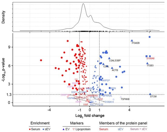 Quantitative comparison of the proteome of sEV and whole serum samples. Volcano plot represents the observed changes in average MS intensities in paired sEV vs. serum comparisons. Protein enrichment is marked with red and blue colored symbols in whole serum and sEVs, respectively. Lipoproteins (empty red upside-down triangles), elements of our whole serum protein panel (red letters, square symbols), sEV protein panel (blue letters, diamond symbols) and common members of the two protein panels (purple letters) are highlighted. Values of –log (p) were obtained from paired Welch’s test in sEV/serum comparisons. Density estimation of log2 (fold change) values is shown on top.
