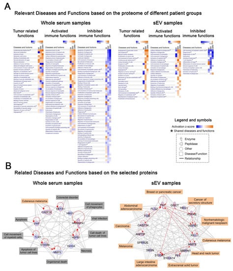 Ingenuity Pathway Analysis (IPA) analyses of whole serum (left) and sEV (right) data derived from the LC-MS analysis. (A) Heatmaps show relevant ‘Diseases and Functions’ in three separated panels related to systemic and tumor-related functions, as well as activated and inhibited immune functions. Z-score indicates activation or inhibition rates of the relevant ‘Diseases and Functions‘ in the three tumorous patient groups compared to the control group. * symbol indicates the shared diseases and functions in whole serum and sEVs. (B) Networks display the selected 10 whole serum or 17 sEV proteins (blue symbols) and their relationships (red lines). Top ten related ‘Diseases (highlighted in orange symbols) and Functions (highlighted in grey)’ are connected by grey lines.