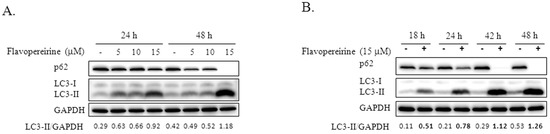 Flavopereirine induced LC3-II accumulation in dose- and time-dependent manners. (A) MDA-MB-231 cells were treated with various concentrations of flavopereirine (5-15 μM) for 24 and 48 h. (B) MDA-MB-231 cells were incubated with 15 μM flavopereirine for 18, 24, 42, and 48 h. LC3-II accumulation and p62 expression were evaluated by Western blotting. glyceraldehyde-3-phosphate dehydrogenase (GAPDH) was used as the internal control. The data are representative of three independent experiments. The band signals were quantified and the ratio of LC3-II related to GAPDH is presented under the blots.