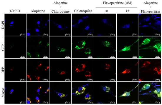 Flavopereirine inhibited autophagic flux in MDA-MB-231 cells. Representative fluorescent images of autophagosomes and autophagolysosomes in MDA-MB-231 cells were transduced with tandem RFP-GFP-LC3B and then independently treated with aloperine (100 μM), chloroquine (25 μM), flavopereirine, or a combination of the two drugs. In the merged images, autophagosomes are presented as yellow or orange puncta (RFP-GFP-LC3B), whereas red puncta (RFP-LC3B) indicate autophagolysosomes because acidification abolishes the green fluorescence. Images were obtained using a 63× oil immersion objective.