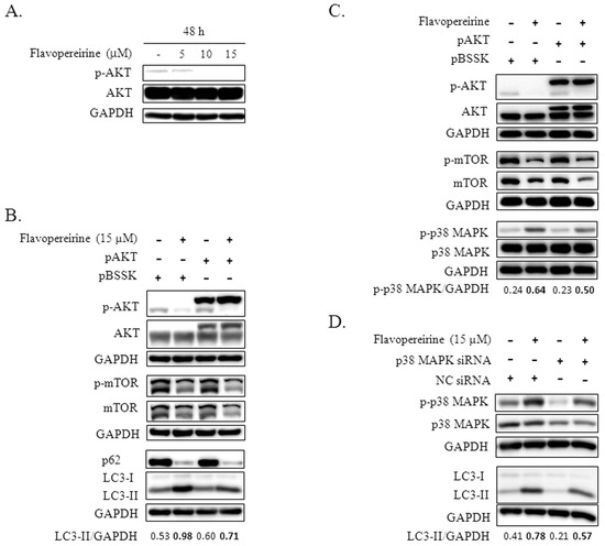 2.2. The Akt/p-p38 MAPK Pathway Was Targeted by Flavopereirine to Inhibit Autophagy