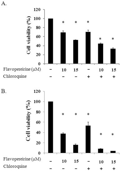 Cell viability of MDA-MB-231 cells treated with individual or a combination of flavopereirine with chloroquine. Cells (4 × 105/well) were treated with different concentrations of flavopereirine, chloroquine (25 μM), or a combination of the two drugs, and cell viability was evaluated by a cell counting kit-8 (CCK-8) after treatment for 24 h (A) and 48 h (B). Histograms show the mean ± SD of three independent experiments performed in triplicate. * Indicates a significant difference from its respective untreated control as analyzed by one-way ANOVA followed by a Bonferroni test (p < 0.05).