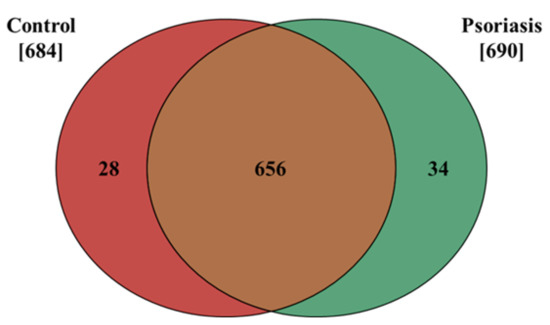 The results presented in this study show that the proteome of fibroblasts isolated from the dermis of psoriatic patients has a different profile than that of control cells. The data obtained from our proteomic analysis allowed us to identify and semi-quantitatively determine the expressions of 718 proteins, 684 of which were found in control fibroblasts, and 690 in cells isolated from the skin of psoriatic patients ( Supplementary Table S1). The distribution of these proteins between the samples is shown on a Venn diagram (Figure 1).