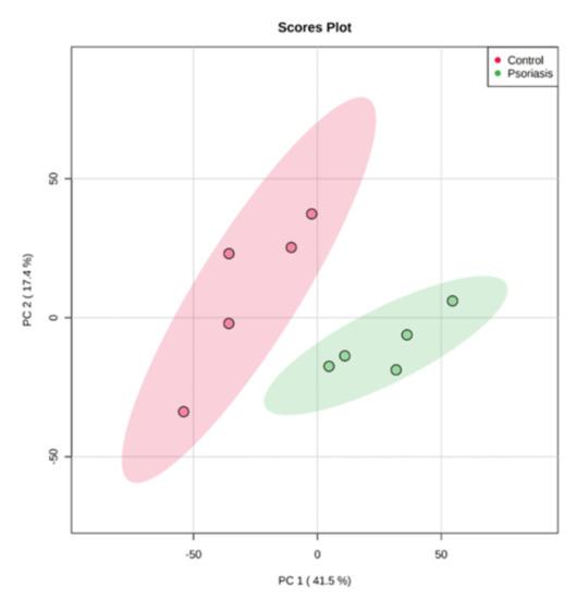 Principal component analysis (PCA) of the proteins in fibroblasts isolated from skin of psoriatic patients (n = 5) and healthy controls (n = 5).