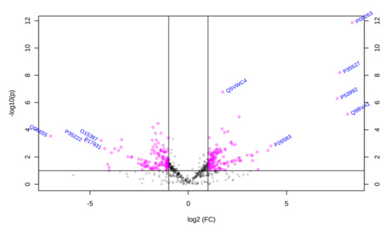 - Tyanova, S.; Temu, T.; Sinitcyn, P.; Carlson, A.; Hein, M.Y.; Geiger, T.; Mann, M.; Cox, J. The Perseus computational platform for comprehensive analysis of (prote)omics data. Nat. Methods 2016, 13, 731–740. [Google Scholar] [CrossRef] [PubMed]