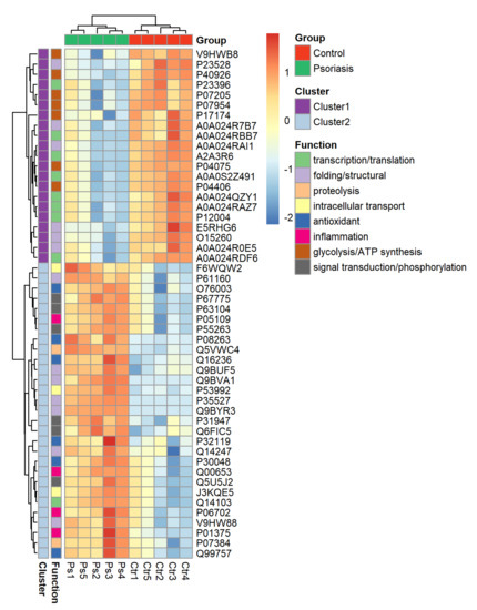 Heat map and clustering of the 50 most significantly changing proteins of fibroblasts isolated from the skin of psoriatic patients (n = 5) and healthy controls (n = 5).