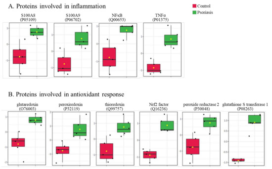 The level of significantly changed proteins involved in the antioxidant response (A) and inflammation (B) of fibroblasts isolated from skin of psoriatic patients (n = 5) and healthy controls (n = 5).