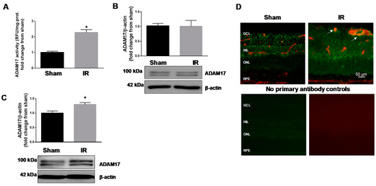 2.1. IR Injury Upregulates Expression and Activity of Retinal ADAM17