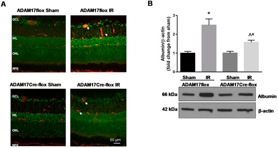 Previously, we showed that knockdown of endothelial ADAM17 protected diabetic retinas from vascular leakage [35]. To determine whether upregulation of endothelial ADAM17 also contributes to vascular permeability in the retinal IR model, we measured extravasation of albumin into retinal tissue in control ADAM17flox and endothelial k/o mice 48 h after reperfusion. Our Western blotting analysis showed that in ischemia-injured eyes of control ADAM17flox mice, leakage of albumin was significantly increased compared to sham-operated eyes (~2.5 fold, p < 0.05; Figure 2B). Knockdown of endothelial ADAM17 substantially attenuated the effects of IR on vascular permeability, as demonstrated by decreased albumin extravasation in retinal tissue of ADAM17 k/o mice (p < 0.05 compared to ADAM17flox IR; Figure 2B). There was no difference in vascular leakage between ADAM17flox and ADAM17Cre-flox mice without exposure to IR (Figure 2B). These data suggest that endothelial ADAM17 activity contributes to the blood retinal barrier breakdown and vascular permeability in IR-injured retinas.