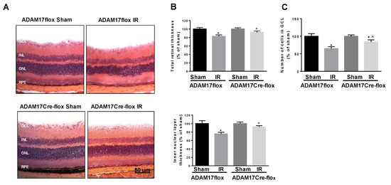 To further investigate the specific contribution of endothelium-derived ADAM17 to retinal IR-induced injury, we used mice lacking ADAM17 expression in the vascular endothelium, as described before [35]. Control ADAM17flox mice and mice lacking endothelial expression of ADAM17 (ADAM17Cre-flox or ADAM17 k/o mice) were subjected to retinal IR. As shown in Figure 2A, minimal expression of ADAM17 was observed in retinal vasculature of sham-operated ADAM17flox mice. No expression of ADAM17 was present in retinal vessels of sham-operated ADAM17 k/o mice (Figure 2A). Ischemia followed by 48 h of reperfusion significantly upregulated expression of ADAM17 in control ADAM17flox mice but not in endothelial k/o ADAM17Cre-flox mice (Figure 2A; white arrows).
