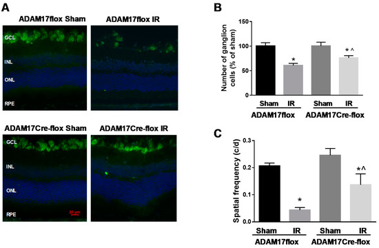 Immunostaining of retinal sections was performed as described [35]. Mouse eyes were enucleated, embedded in optimal cutting temperature mounting medium (Tissue-Tek, Torrance, CA, USA), frozen on dry ice, and cryostat sectioned (10 µm). Slides were incubated overnight at 4 °C with anti-ADAM17 (1:500; LSBio, Seatle, WA, USA), anti-CD31 (10 µg/mL; R&D Systems, Minneapolis, MN, USA), and anti-RNA binding protein with multiple splicing (RBPMS) (1:500; GeneTex, Zeeland, MI, USA) antibodies, followed by incubation with appropriate fluorescence-conjugated secondary antibodies (Life Technologies, Eugene, OR, USA). Secondary antibody controls (no primary antibody) were included in each experiment. Sections were mounted using Fluoroshield mounting medium containing 4′,6-diamidino-2-phenylindole (DAPI) to visualize nuclei (Sigma-Aldrich, St. Louis, MO, USA) and examined for epifluorescence using a Zeiss Axioplan-2 microscope (Carl Zeiss, Göttingen, Germany) equipped with the Axiovision program (version 4.7; Carl Zeiss).