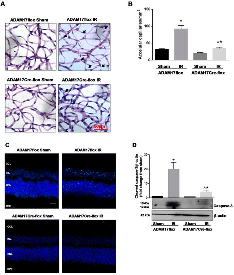 IR-induced vascular degeneration is reduced in mice with genetic ablation of endothelial ADAM17. (A) Representative images of retinal vascular digest and (B) quantification of degenerate capillaries in control ADAM17flox and ADAM17Cre-flox mice subjected to retinal IR. Arrows point at degenerate capillaries. Values are mean ± SE. * p < 0.05 vs. corresponding sham; ^ p < 0.001 vs. ADAM17flox IR; n = 5 for each group. Scale bar, 50 µm. (C) TUNEL (terminal deoxynucleotidyl transferase dUTP nick end labeling) staining (green) to assess apoptosis in retinal cryosections 48 h after reperfusion. Nuclei were stained with DAPI (blue). Scale bar, 20 µm. (D) Representative Western blots and densitometric analysis of cleaved caspase-3 evaluated 48 h after reperfusion. Actin was used as an internal control. Values are mean ± SE. Results are presented as fold change from sham. * p < 0.05 vs. corresponding sham; ^ p < 0.05 vs. ADAM17flox IR; n = 5 in each group.