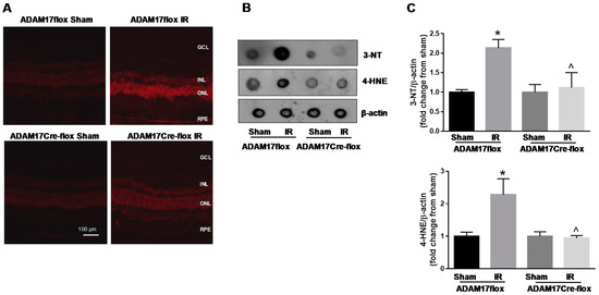 The generation of excessive reactive oxygen and nitrogen species (ROS and RNS, respectively) is a critical primary event mediating retinal IR-induced injury [13,38]. To understand whether the protective effects of loss of endothelial ADAM17 in the IR-injured retina are associated with reduction in oxidative stress, we compared intracellular superoxide formation in retinal cryosections of ADAM17flox and ADAM17Cre-flox mice using cell-permeable redox-sensitive probe dihydroethidium (DHE). The retinas from sham-operated ADAM17flox and ADAM17Cre-flox mice exhibited low levels of detectable ROS (Figure 6A). Following 6 h of reperfusion, DHE fluorescence increased in retinas of ADAM17flox mice and this effect of IR was significantly reduced in ADAM17Cre-flox mice indicating an attenuation of retinal superoxide levels in these mice (Figure 6A). Overproduction of ROS and RNS can lead to modifications of cellular molecules resulting in formation of 3-nitrotyrosine (3-NT) and 4-hydroxynonenal (4-HNE). Dot blot analysis showed a marked increase of both 3-NT and 4-HNE in IR-injured retinas of ADAM17flox mice 6 h after reperfusion (Figure 6B,C). Endothelial ADAM17 knockdown prevented the increase of both these markers in injured retinas of ADAM17Cre-flox mice (Figure 6B,C).