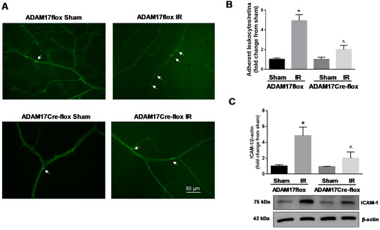 IR is associated with increased inflammatory responses in the retina [9,13,39]. To investigate the contribution of endothelial ADAM17 to vascular inflammation, we assessed leukocyte adhesion in retinas of control mice and mice lacking ADAM17 following in situ labeling with fluorescein-labeled concanavalin A (ConA) lectin [35]. Our analysis showed an increase in leukocyte adhesion in ischemia-injured retinal microvasculature of control ADAM17flox mice (p < 0.001 compared to corresponding sham; Figure 7A,B). Knockdown of endothelial ADAM17 significantly decreased the number of adherent leukocytes in retinas of ADAM17Cre-flox mice (p < 0.01 compared to ADAM17flox IR; Figure 7A,B). As ICAM-1 is involved in retinal IR injury, we evaluated its protein levels in retinas of control mice and mice lacking ADAM17 following IR. As shown in Figure 7C, IR (48 h) increased protein levels of this adhesion molecule in retinas of ADAM17flox mice (p < 0.01 compared to corresponding sham) but knockdown of endothelial ADAM17 markedly reduced retinal ICAM-1 in IR-injured eyes of ADAM17Cre-flox mice (p < 0.05 compared to ADAM17flox IR; Figure 7C). These data further confirm reduced inflammatory responses in mice lacking endothelial ADAM17.