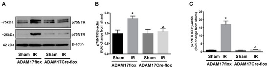 ADAM17-mediated proteolytic cleavage of extracellular domain of p75 neurotrophin receptor (p75NTR) can result in generation of a pro-apoptotic intracellular domain, p75ICD, in a process called regulated intramembrane proteolysis [40,41]. To assess whether this ADAM17-regulated mechanism could contribute to retinal IR-induced cellular degeneration, we assessed cleavage of p75NTR in the IR-injured retinas of control mice and mice lacking expression of ADAM17. Our Western blotting analysis using p75NTR cytoplasmic domain-specific antibody showed that IR (6 h) caused a significant upregulation of p75NTR in control ADAM17flox mice (Figure 8A,B). Consistent with upregulated status of ADAM17 in IR-injured retinas of ADAM17flox mice, increased expression of p75NTR in these mice was associated with accumulation of p75NTR cleaved fragment of about 25 kDa (Figure 8A,C). No changes in the expression of full-length p75NTR or accumulation of its cleaved fragment were observed in mice with conditional inactivation of ADAM17 that undergo IR (Figure 8A–C). These data suggest that ADAM17-mediated p75NTR proteolytic cleavage in IR can contribute to apoptotic events, which culminate in retinal cell degeneration.