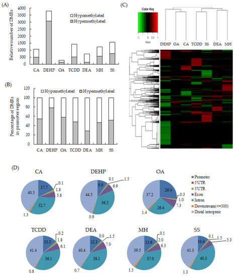 Identification and distribution of the differentially methylated regions (DMRs) specific to each non-genotoxic carcinogen (NGTXC) during the cell transformation. (A) Histogram of the distribution of the relative number of hypermethylated and hypomethylated DMRs per NGTXC. (B) Histogram of DMRs in the promoter region (−1500–1500). In (A,B), the DMRs that were unique to each NGTXC-induced transformed focus were separated by methylation status and classified as hypermethylated or hypomethylated with respect to the untransformed cells. (C) The heatmap of the DNA methylation level at DMRs specific to each NGTXC. Each column represents a different NGTXC, and each row represents a different DMR specific to each NGTXC. The red color represents hypermethylation, while the green color represents hypomethylation. (D) The distribution of DMRs in different genomic regions: 3′-UTR, 5′-UTR, exon, intron, intergenic, promoter, and downstream (≤300).