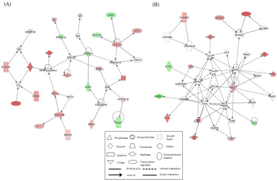 Top two networks based on ingenuity pathway analysis (IPA) showing interactions between the controls and the case. (A) Cell-to-cell signaling and interaction (control vs. DEHP). (B) Cancer, cell death and survival (control vs. OA). The lines between the genes represent known interactions (solid lines represent direct interactions; dashed lines represent indirect interactions). Each gene is displayed using shapes that represent the functional class of the gene product as indicated in the legend. The intensity of the red and green colors indicates the degree of up- and downregulation, respectively. A total of 25 networks (p-scores > 18) are provided in Supplementary Table S9.