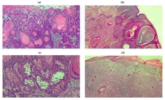 The clinical features of BCCs are extremely heterogeneous (Figure 1), and a universal classification is currently unavailable [55,56]. Clinical variants can be subdivided into: (i) nodular; (ii) superficial; (iii) dibroepithelial; and (iv) morpheaform. Some BCCs contain melanin, while nodular pattern may characterize any histologic variant. The nodular BCC shows high propensity to ulceration, as well as worse prognosis. Other variants include the cystic, mucinous, basosquamous and micronodular as well as multifocal BCC (Figure 2). In particular, the basosquamous BCC is a mixed variant characterized by histologic features of both BCC and SCC, showing high aggressiveness including its capability of local and distant metastasis [18].