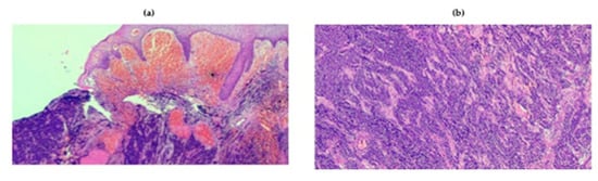 The diagnosis of MCC is clinically challenging, thereby relying almost entirely on histology examination. Morphologically, MCC is characterized by the aggregation of small, monomorphic, round cells with scant cytoplasm in the context of nodules or sheets located in the dermis or subcutaneous tissue (Figure 5) [151]. Metastatic small-cell lung cancer (SCLC), small-cell melanoma, Ewing’s sarcoma and some lymphomas can have pathological features similar to those of MCC, and immunohistochemistry (IHC) appears useful in the differential diagnosis of these entities. Classical IHC markers of MCC include chromogranin-A, synaptophysin, cytokeratin 20 (CK20) and MCPyV-associated antigens. The negativity of thyroid transcription factor 1 (TTF1) may enable the distinction between MCC and SCLC metastatic to the skin, while the assessment of the Ewing’s translocation may be necessary to rule out a cutaneous metastasis of Ewing’s sarcoma. Strikingly, MCC and SCC may co-exist in the same lesion, possibly as UV-induced unrelated malignancies or, intriguingly, as tumors originating from the same multi-potent stem cell, and diverging in their differentiation at a later stage [151].