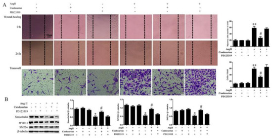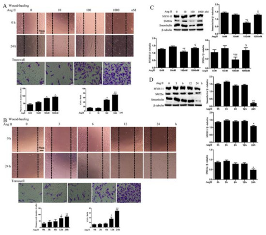 2.1. Ang II Promotes HA-VSMC Migration and Down-Regulates Differentiation Marker Proteins via AT1 Receptor