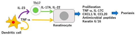 Tumor necrosis factor(TNF-α)/interleukin-23 (IL-23)/IL-17 axis in the pathogenesis of psoriasis. Dendritic cells activated by various stimuli in the lesional skin secrete TNF-α which acts on themselves in an autocrine manner and induces IL-23 secretion. The IL-23 promotes the proliferation and survival of Th17 cells. The activated Th17 cells overproduce IL-17A or IL-22 which act on keratinocytes and induce their proliferation and production of TNF-α, antimicrobial peptides, or chemokines C-X-C motif ligand 1 (CXCL1)/8, C-C-motif ligand 20 (CCL20), which further recruit neutrophils, lymphocytes, or monocytes. The activation of keratinocytes by IL-17A or TNF-α induces the expression of keratins 6 and 16, which are associated with acanthosis and reduced turnover time in the epidermis.